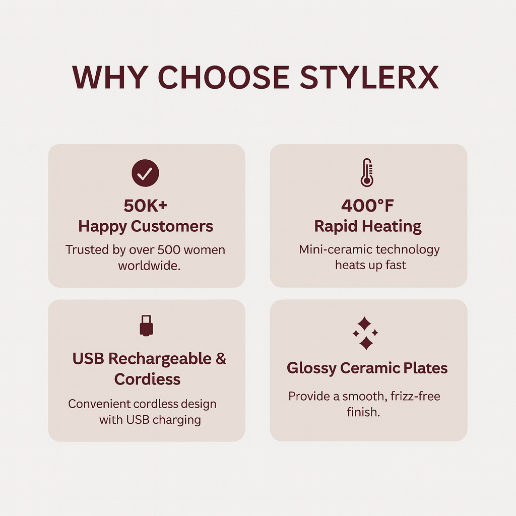 StylerX brings professional styling in your pocket. Ultra-slim, lightweight, and travel-ready, it fits perfectly in your handbag while delivering